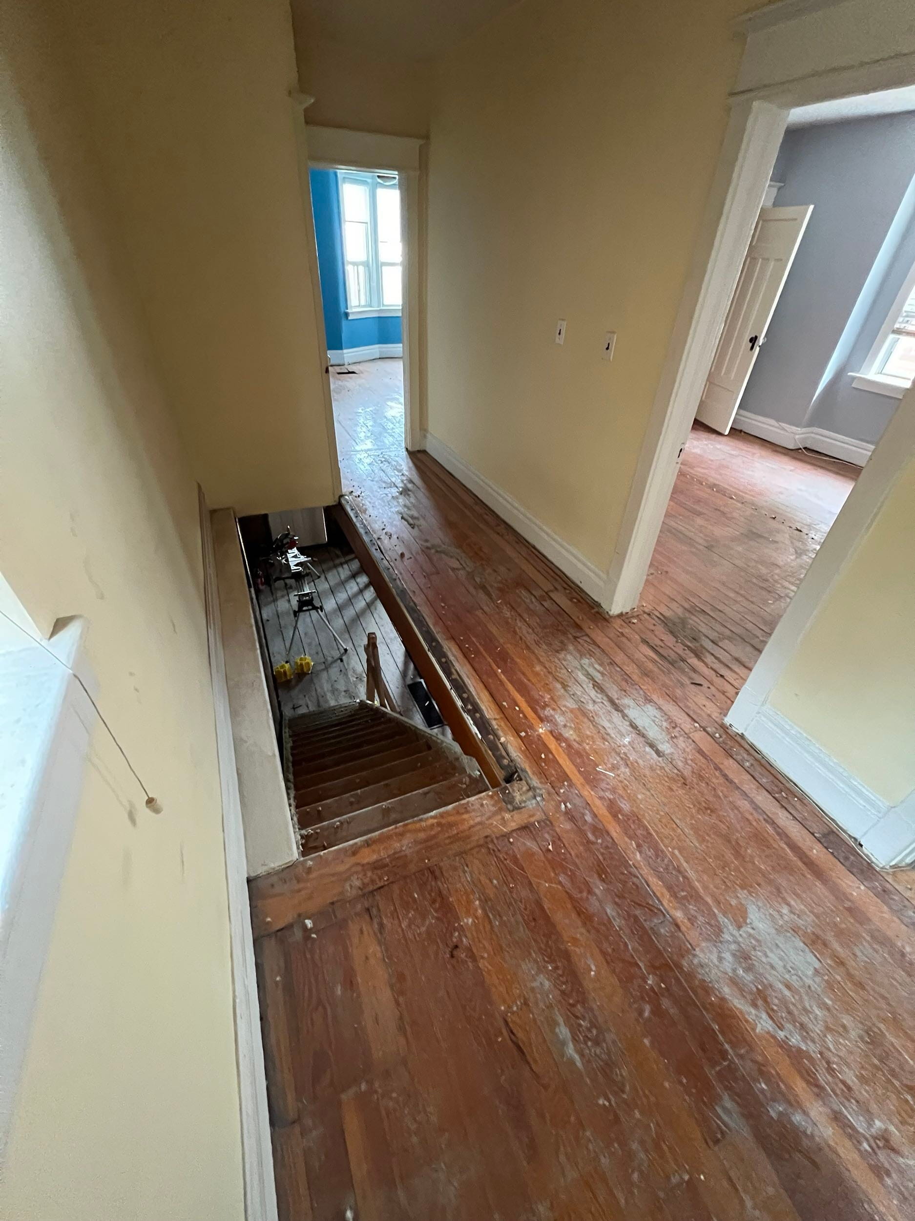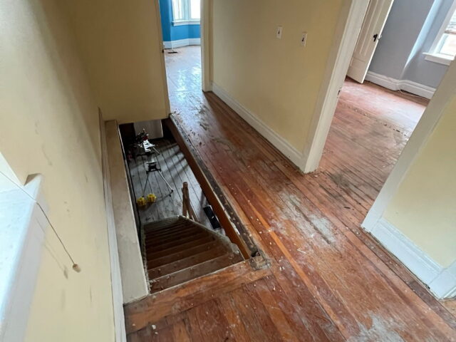 We renovated the entire main floor, including removing walls and a second stairwell to the basement, installing a new kitchen and powder room, and completing all new electrical, HVAC, and plumbing. In addition, we completed extensive work throughout the whole house, including new floors, walls, windows and doors, as well as new siding and a front porch. We also renovated the upstairs bathroom and primary bedroom.
